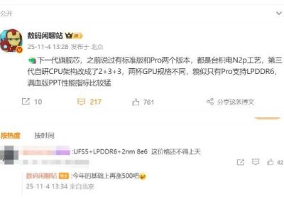据博主数码闲聊站爆料,高通骁龙8 Elite Gen6(以下简称骁龙8E6)系列存在标准版与Pro版这两种选择。它们均基于台积电N2P工艺(2nm)制程打造,不过两者的GPU规格存…