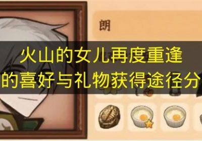 在《火山的女儿:再度重逢》里,朗喜欢金色兰花、小狐狸之类的物品。能大幅提升他好感度的关键礼物有奶油焗蛋(通过烹饪获取)、蓝色的宝石蛋(在冰霜峡谷事件中可得)、史前的化石(冥滩事件产…