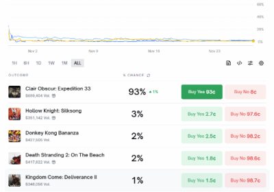 知名博彩网站Polymarket披露了各游戏荣获TGA年度最佳的概率。当中,《光与影:33号远征队》以93%的概率,在所有其他游戏中呈现出断崖式的领先态势。 在被提名的游戏里,《空…